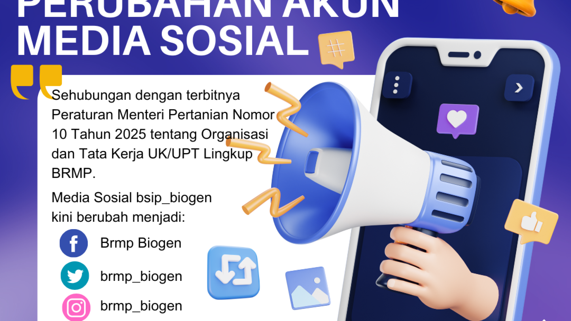 Berikut nama akum medsos yang telah disesuaikan ya. Penyesuaian ini dilakulan berdasarkan Perpres Nomor 192 Tahun 2024 tentang Kementan, dan Permentan Nomor 10 Tahun 2025 Tentang Organisasi Dan Tata Kerja UK/UPT Lingkup BRMP.
