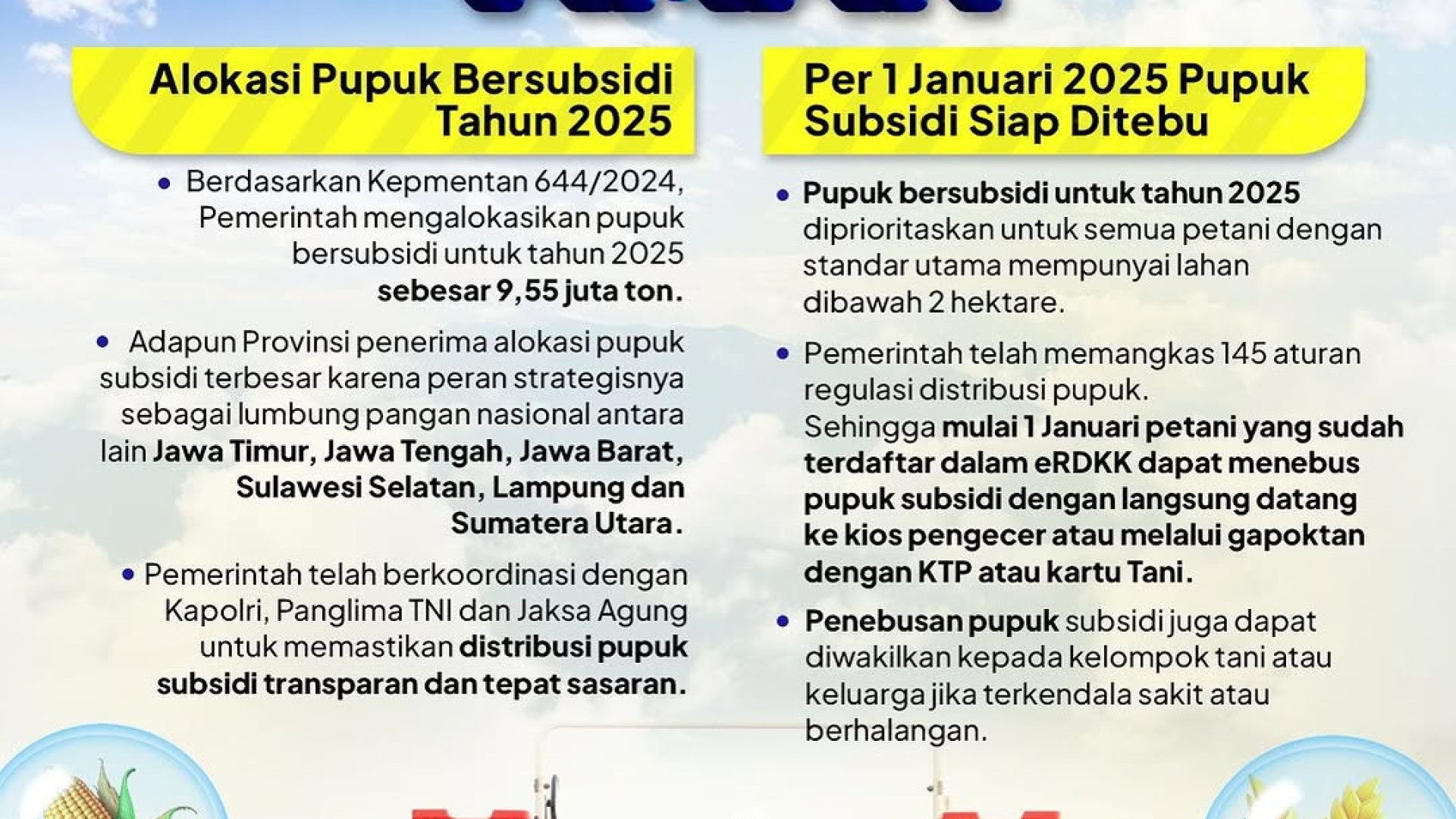 Berdasarkan Keputusan Menteri Pertanian @a.amran_sulaiman nomor 644/2024, Pemerintah mengalokasikan pupuk bersubsidi sebesar 9,55 juta ton di tahun 2025.
