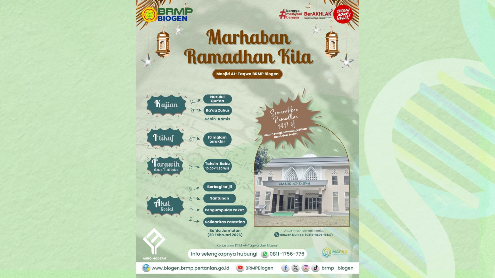 Semarakan Ramadhan 1447 H dengan mengukuti Kajian, I'tikaf, Tarawih dan tahsin, serta Aksi sosial yang diselenggarakan di Masjid At-Taqwa, BRMP Biogen. Semoga Ramadhan tahun ini menjadikan kita sebagai individu yang lebih baik. Amiin