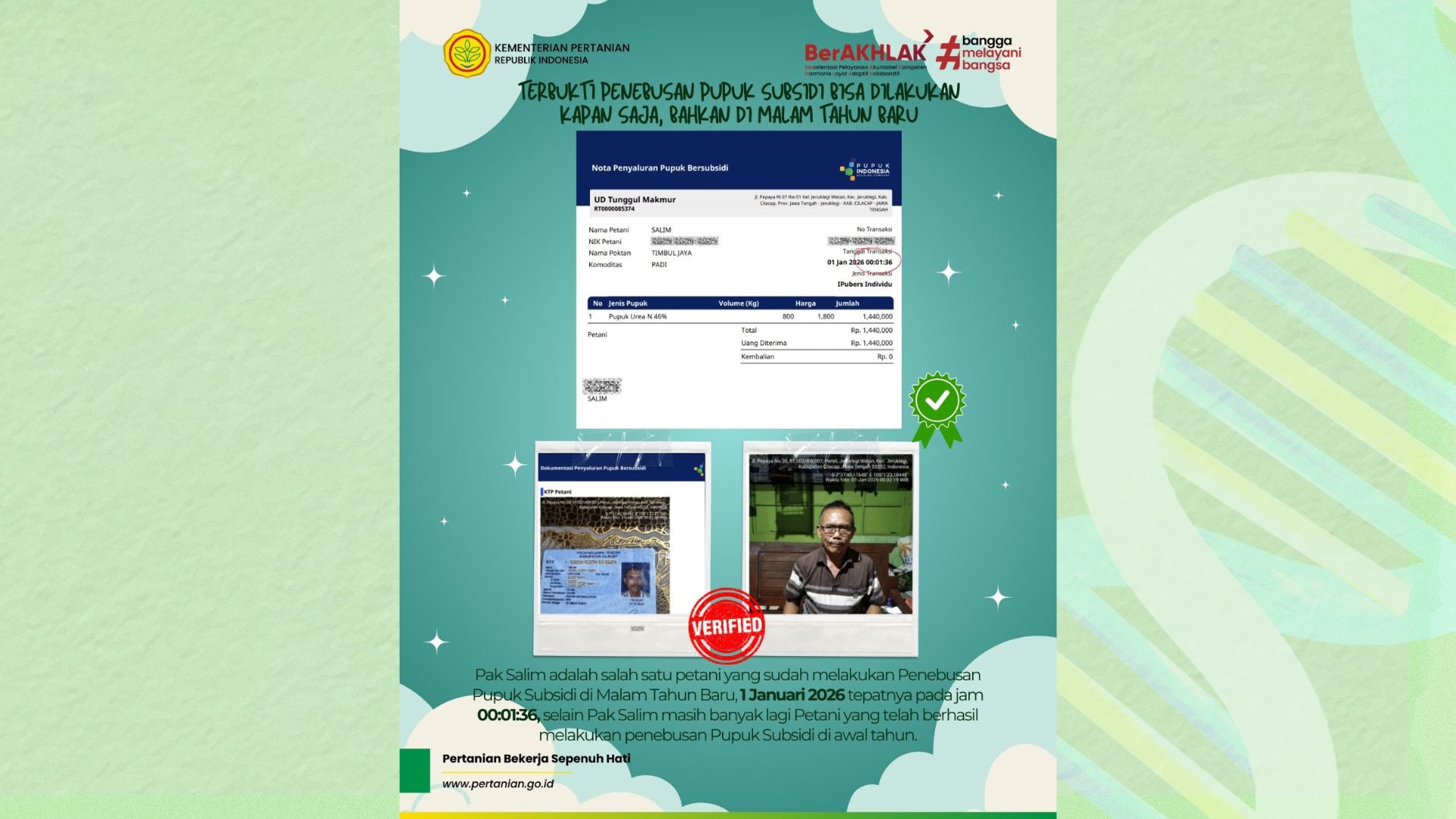 Tahun baru, pupuk langsung ditebus.Detik pertama 2026, penyaluran pupuk bersubsidi langsung berjalan. Hanya dalam 16 menit, tercatat 147 transaksi penebusan pupuk subsidi oleh petani di berbagai daerah