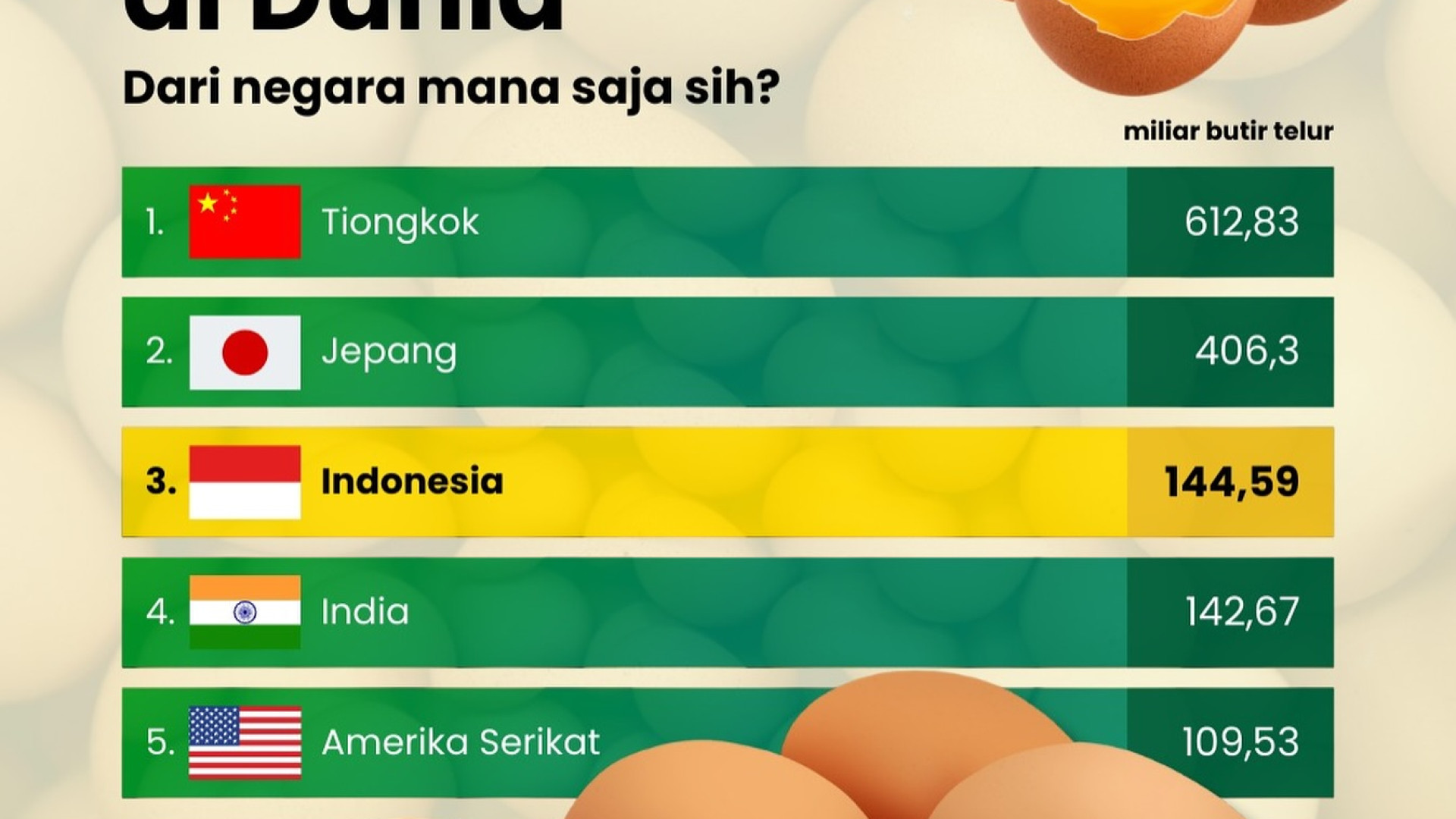 Produksi telur Indonesia menembus angka 144,59 miliar butir dan menempatkan kita di peringkat ketiga dunia sebagai produsen telur terbesar, menurut data FAO.