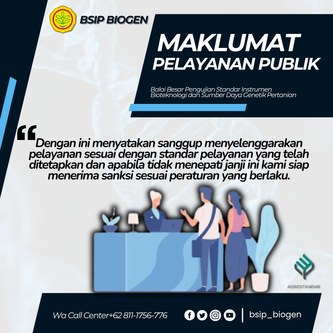 BBPSI Biogen memiliki enam pelayanan publik yang diatur dalam Standar Pelayanan Publik (SPP) yang diputuskan melalui Keputusan Kepala BBPSI Biogen Nomor 844/Kpts/HM.130/H.11/11/2023. Sebagai badan publik, BSIP berkomitmen menyelenggarakan pelayanan sesuai standar dan peraturan perundang-undangan. BSIP memastikan setiap masyarakat dapat memperoleh layanan dengan mudah dan cepat. Komitmen ini tidak hanya menunjukkan dedikasi BSIP dalam melayani masyarakat, tetapi juga menjadi cerminan dari upaya untuk meningkatkan kualitas layanan publik di sektor pertanian.